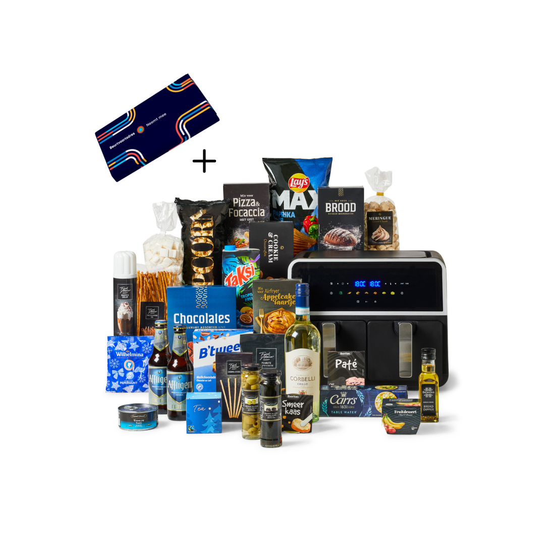 Naast de gratis Tony Chocolonely reep die je bij elke bestelling ontvangt, is er ook nog een kans dat deze reep de gouden wikkel bevat. En dan win je één van de 3 mega kerstpakketten. Het kerstpakket bestaat uit maar liefst 30 onderdelen waaronder een Emerio Dual Airfryer!